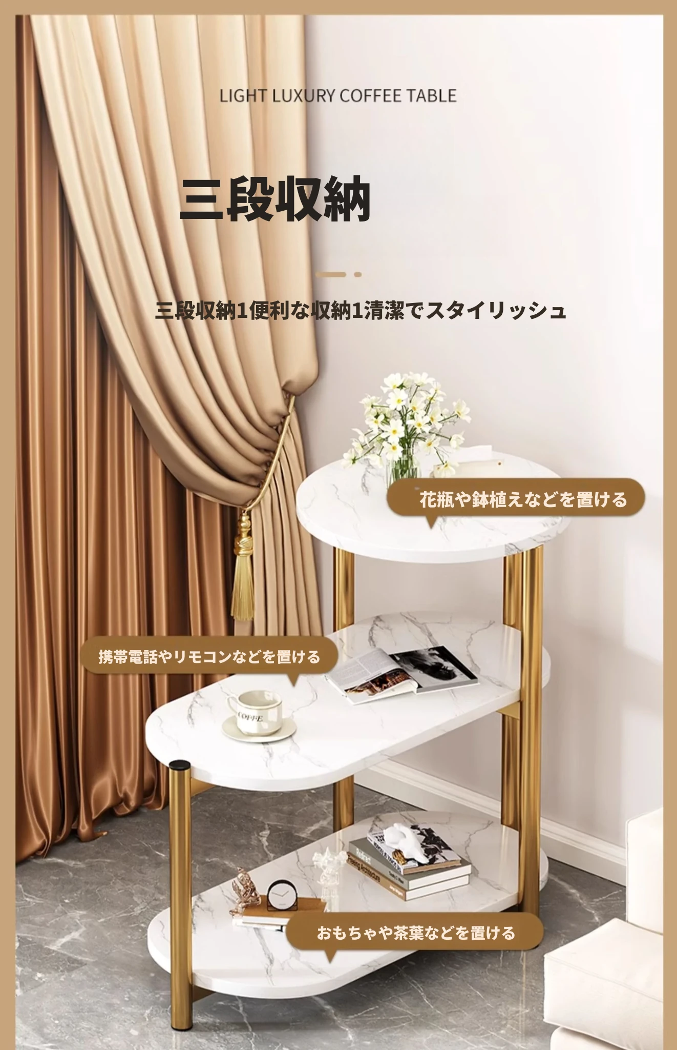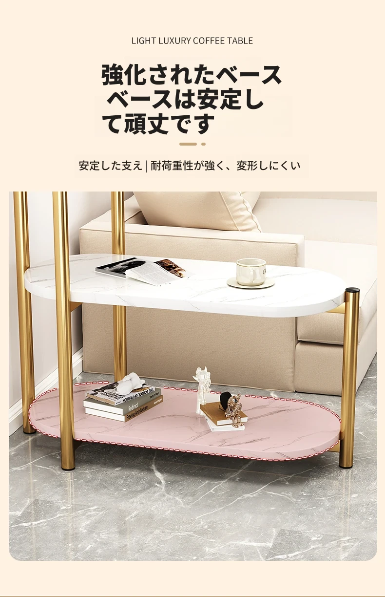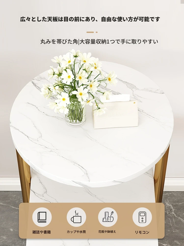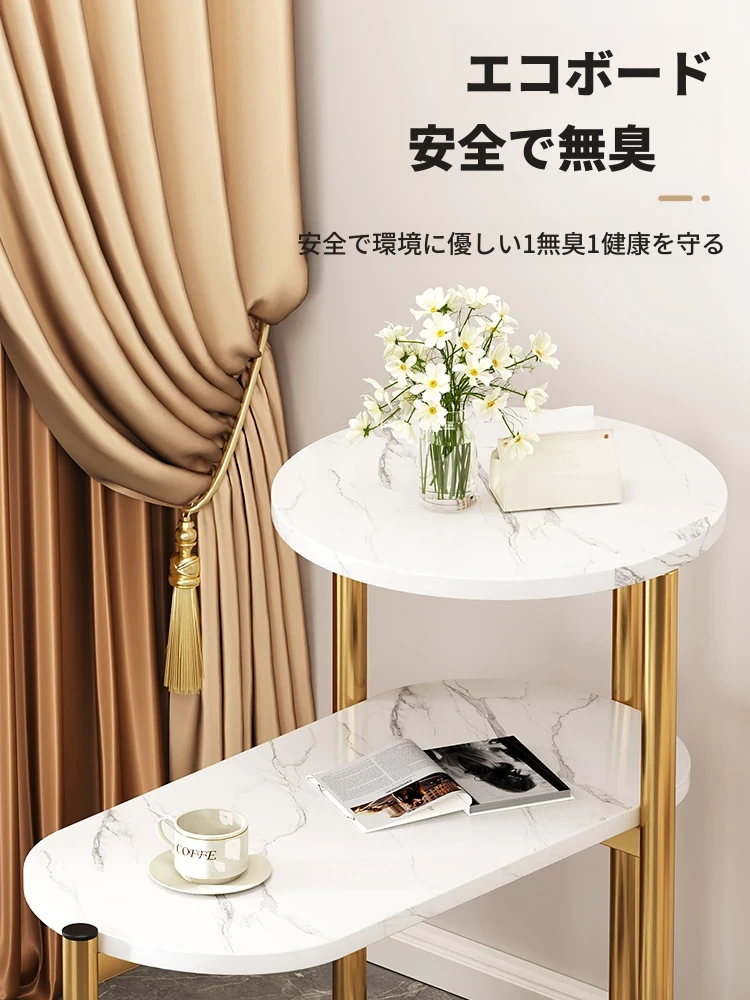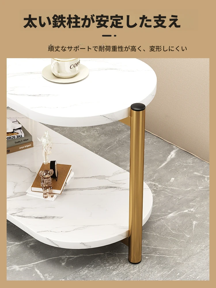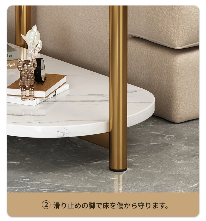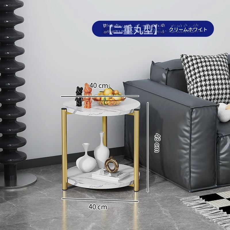 【二層ラウンドエッジテーブル】ホワイト大理石模様-ゴールドフレーム