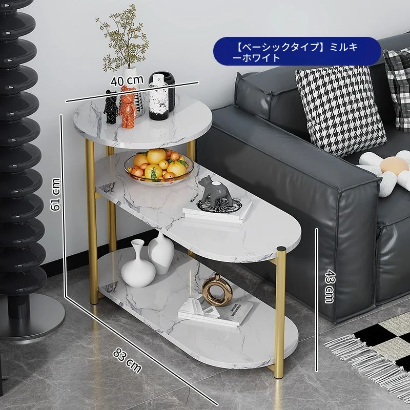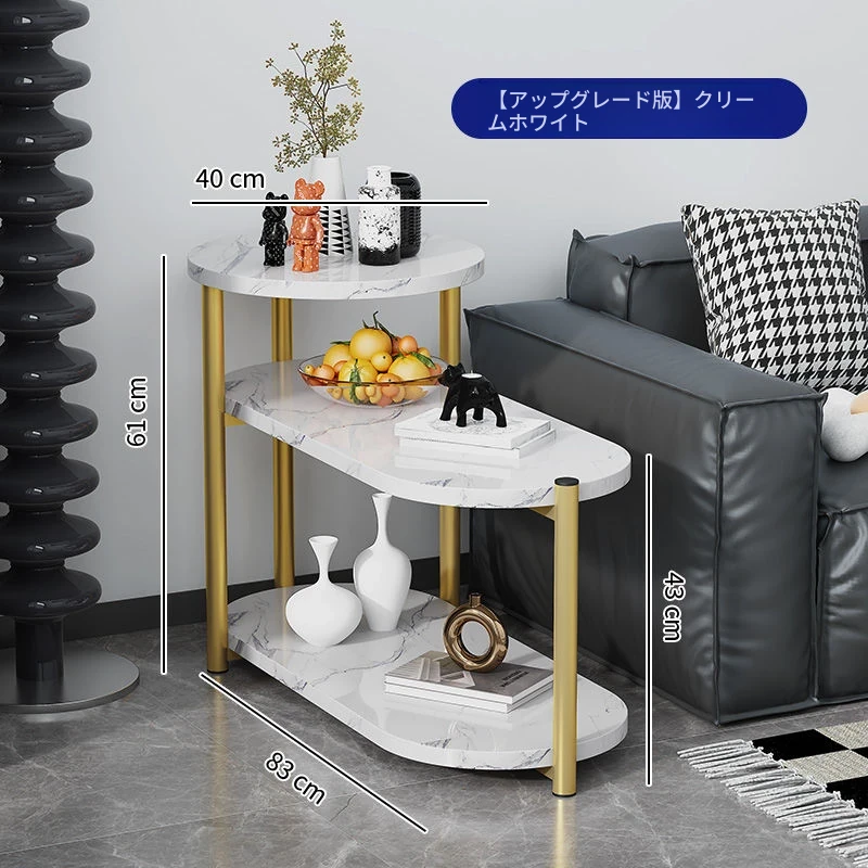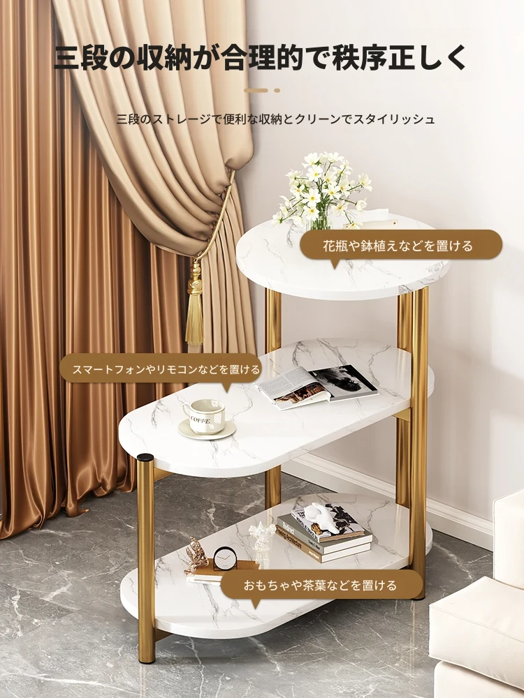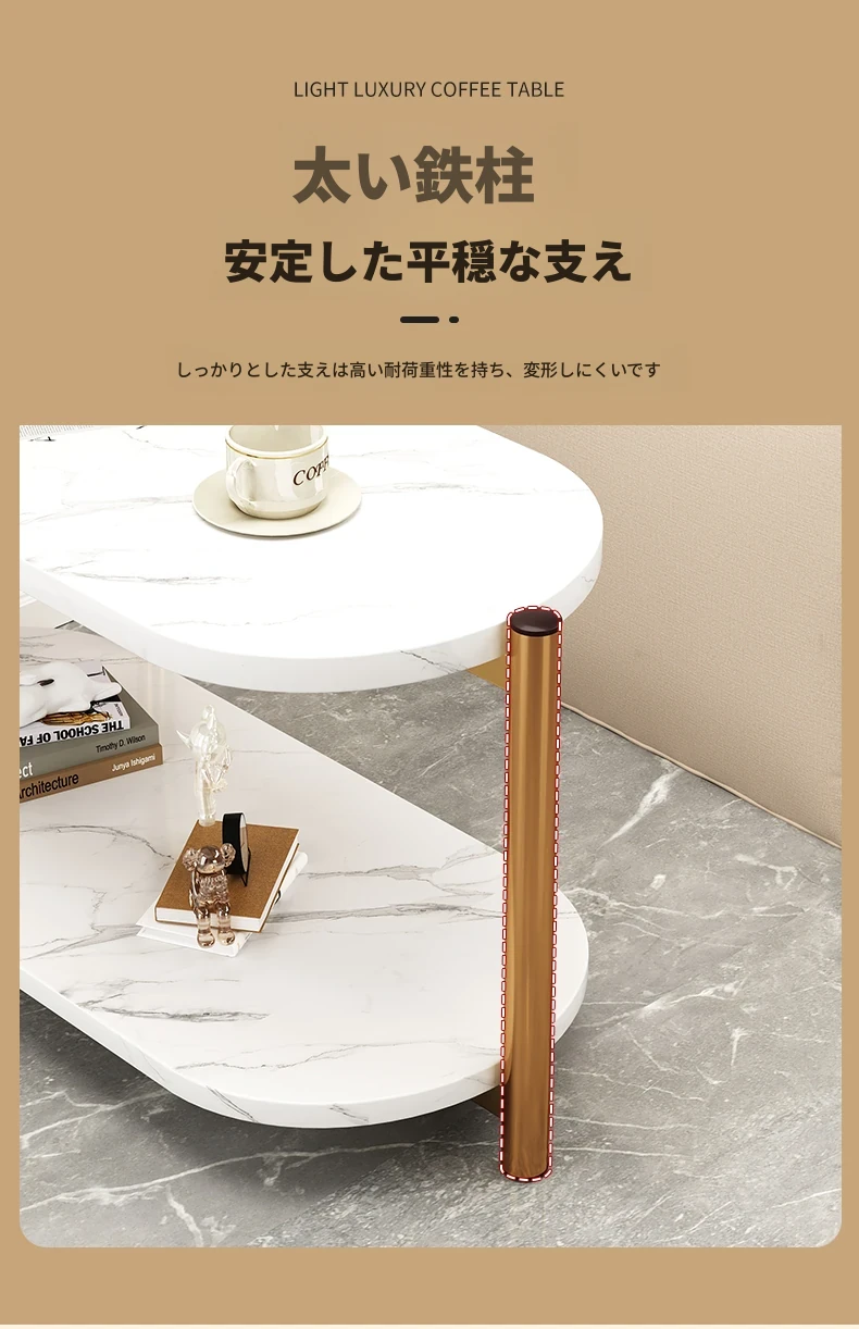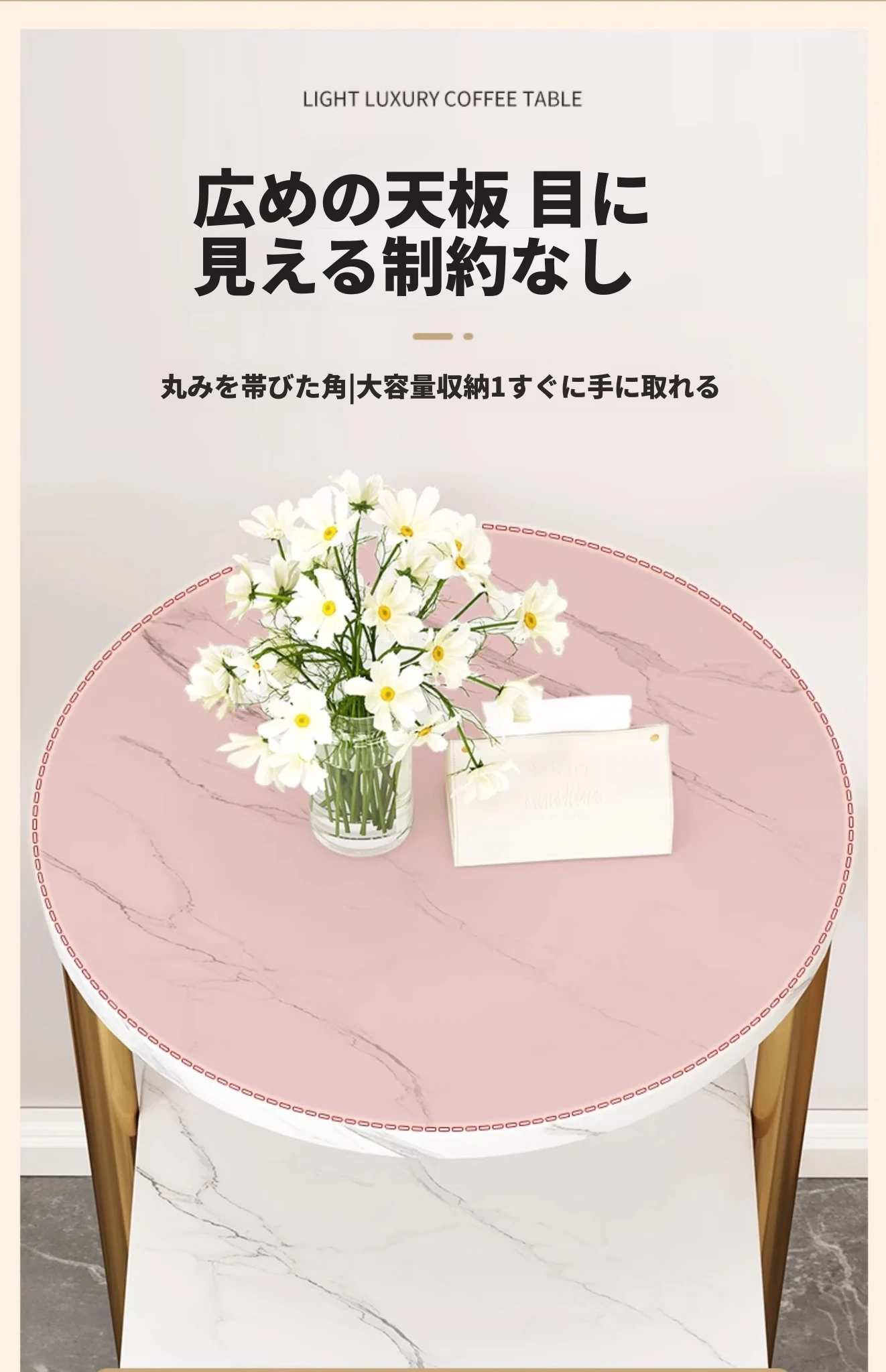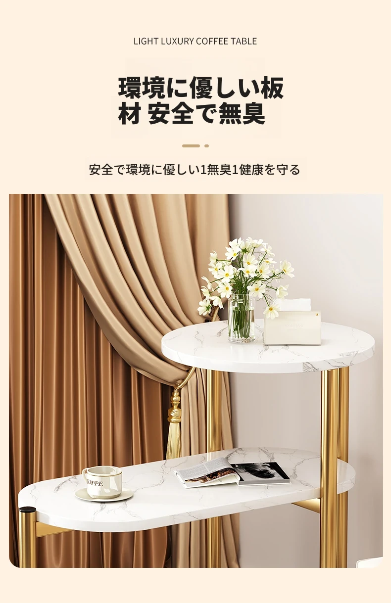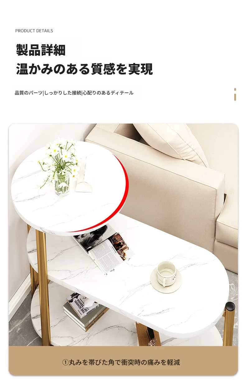 【二層ラウンドエッジテーブル】ホワイト大理石模様-ゴールドフレーム