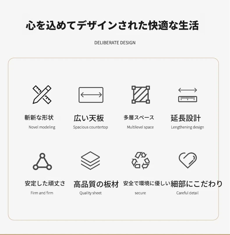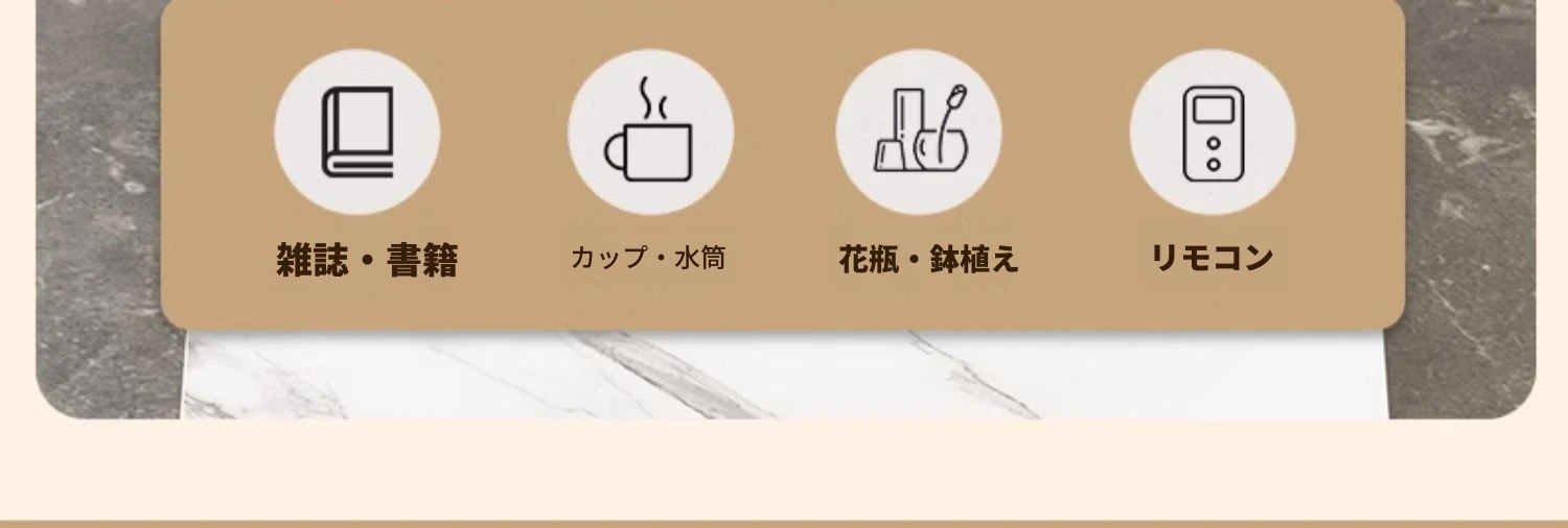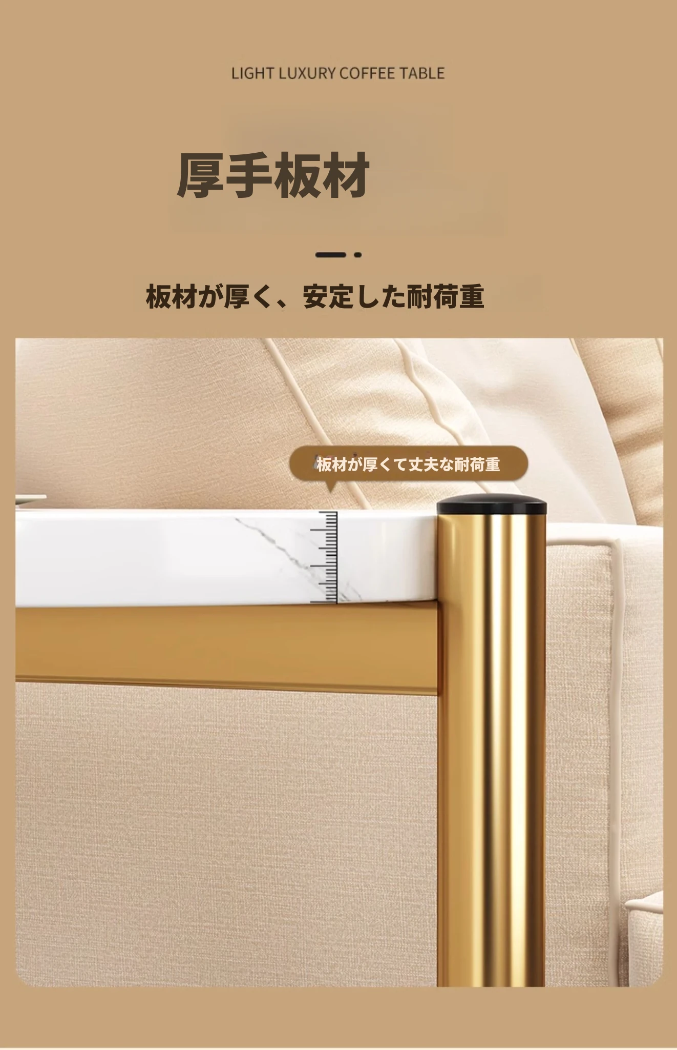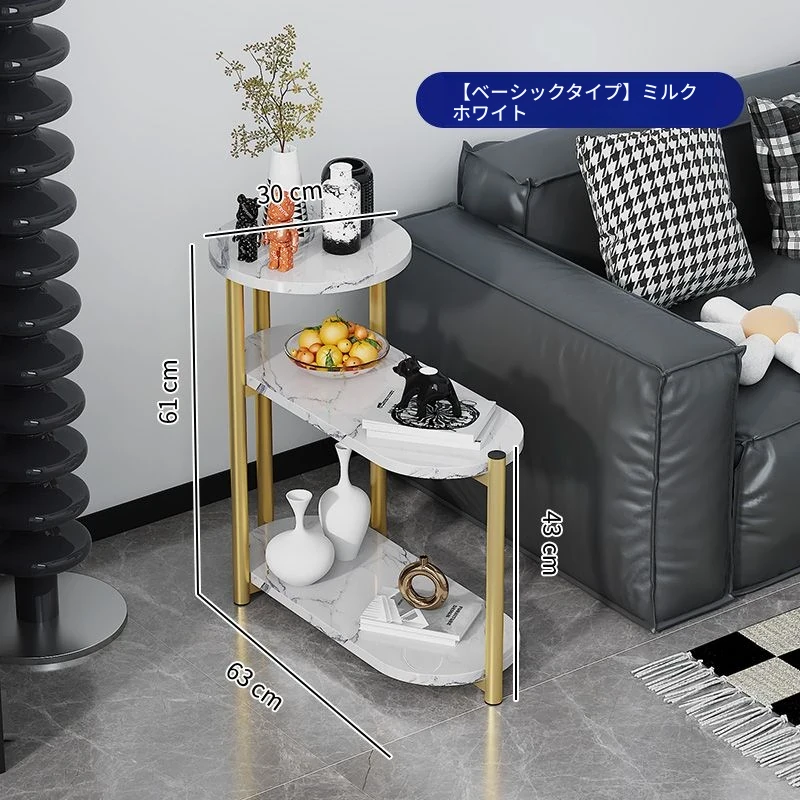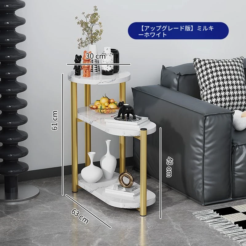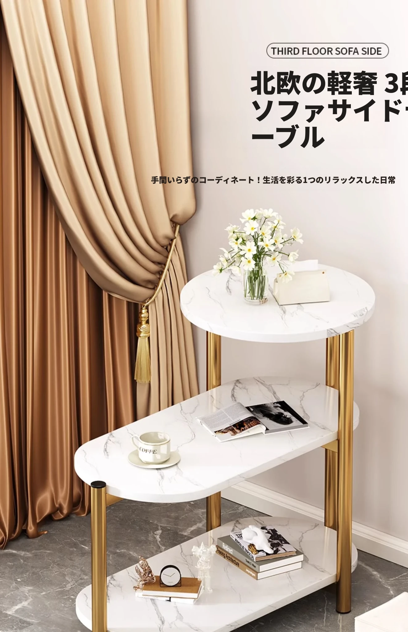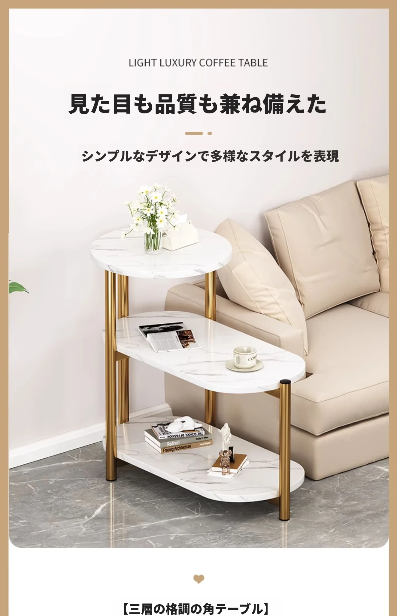 【二層ラウンドエッジテーブル】ホワイト大理石模様-ゴールドフレーム