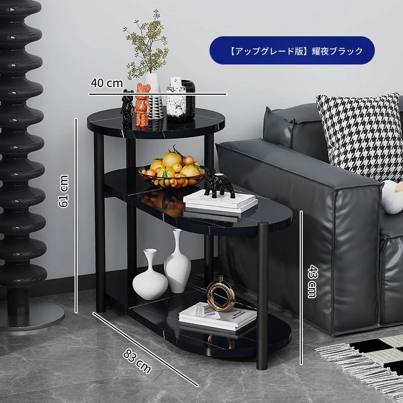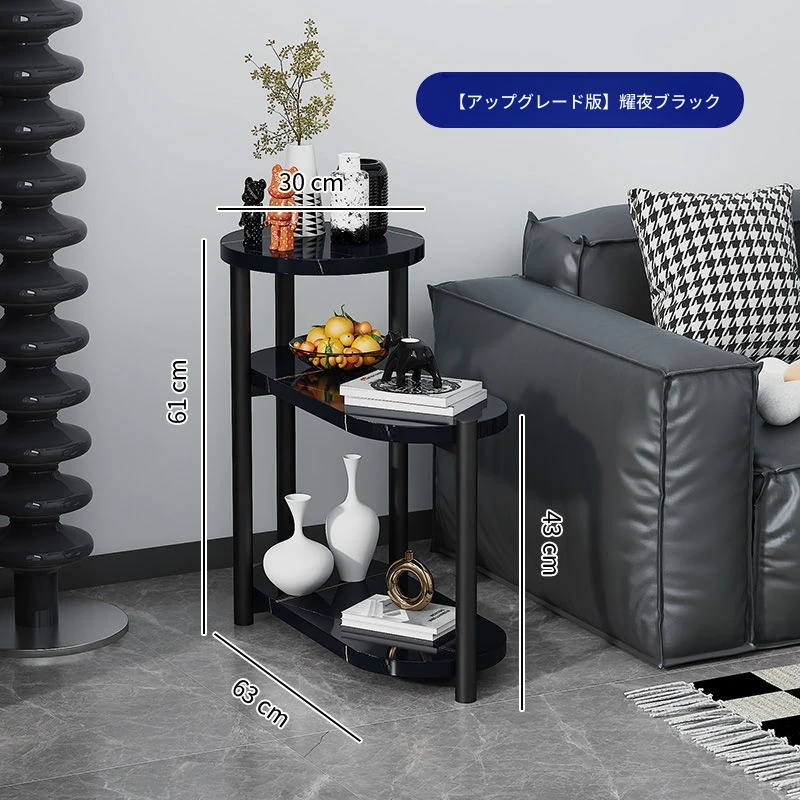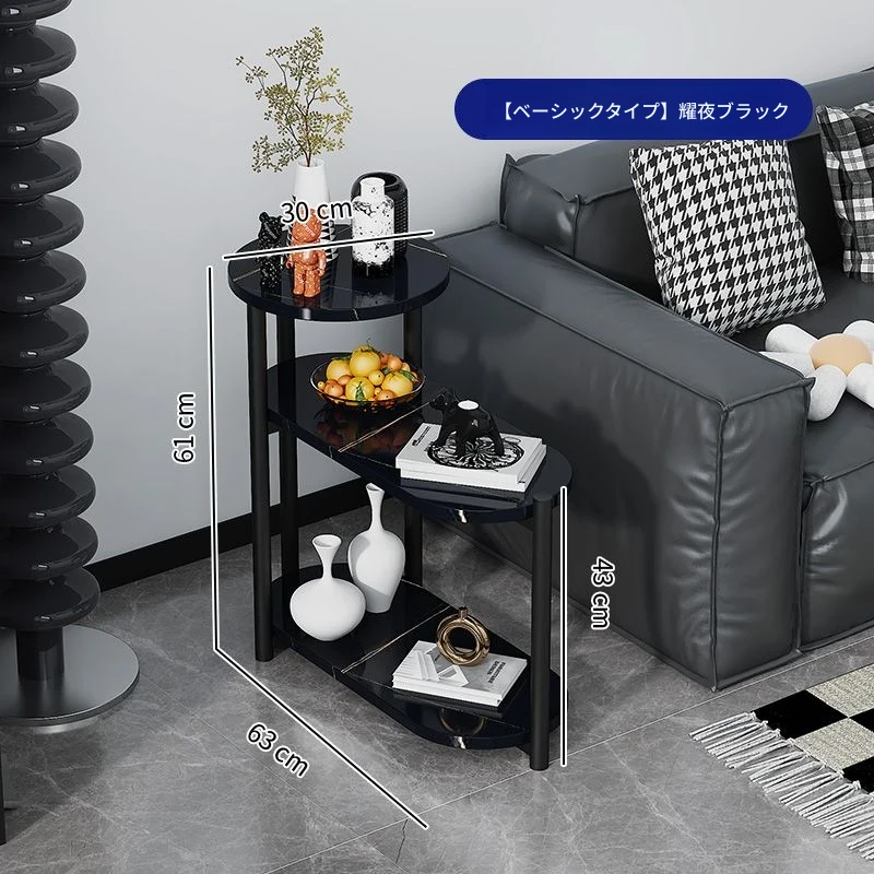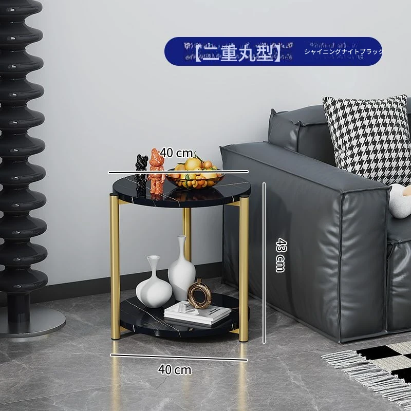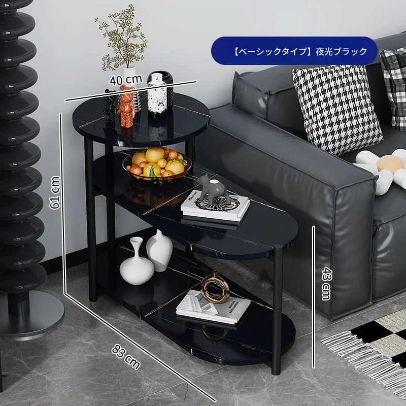 【二層ラウンドエッジテーブル】ブラック大理石模様-ブラックフレーム